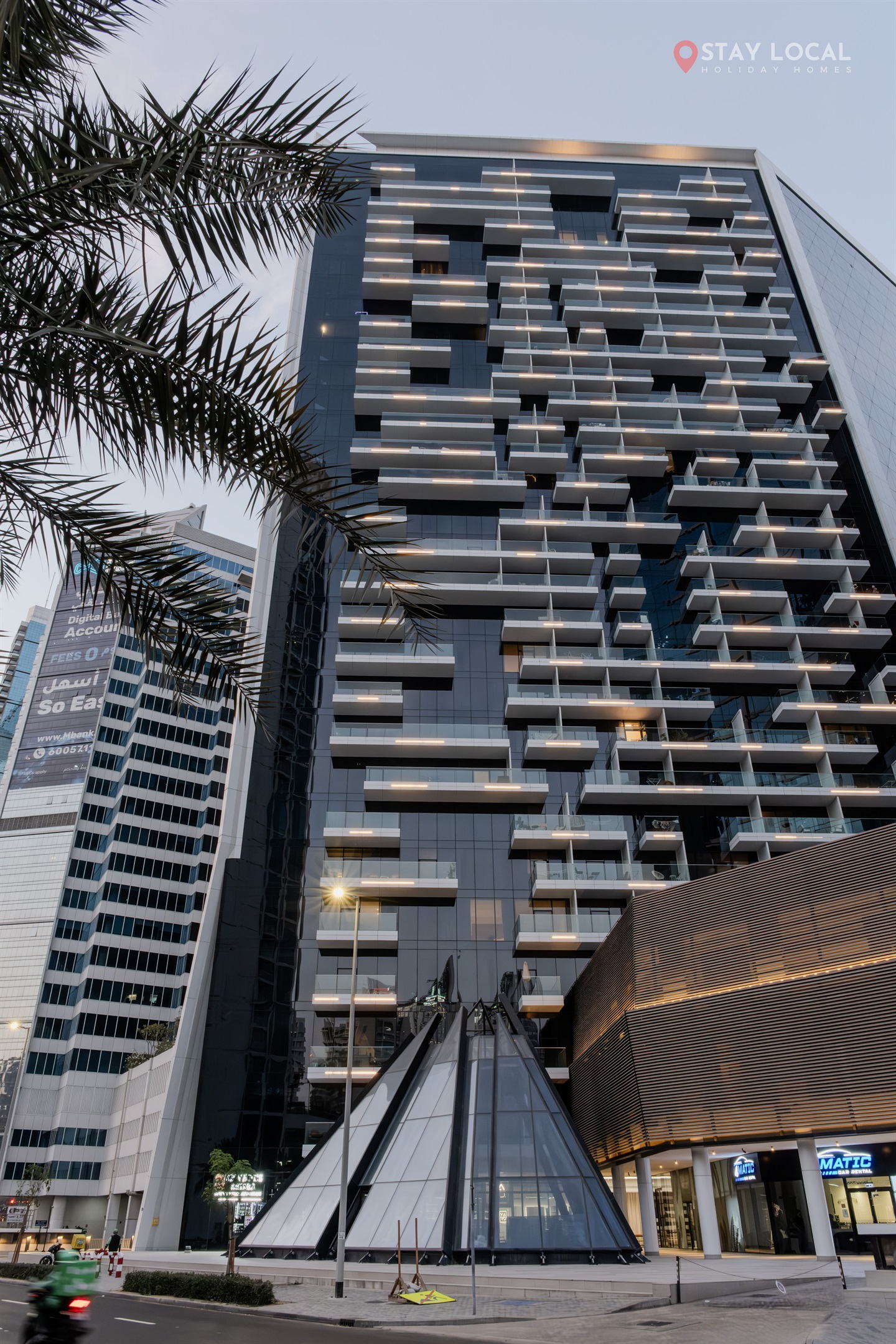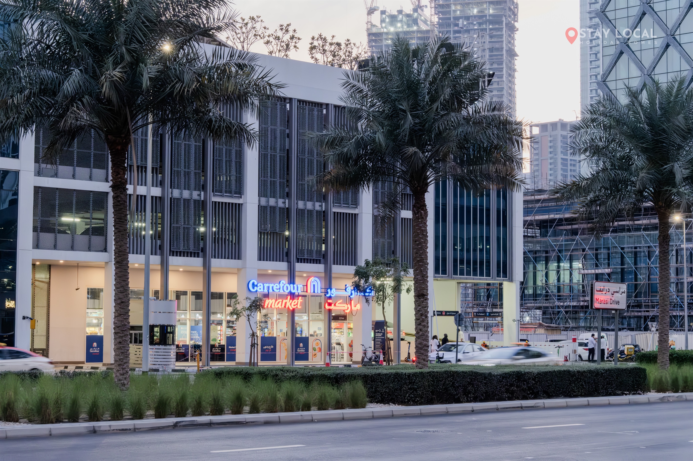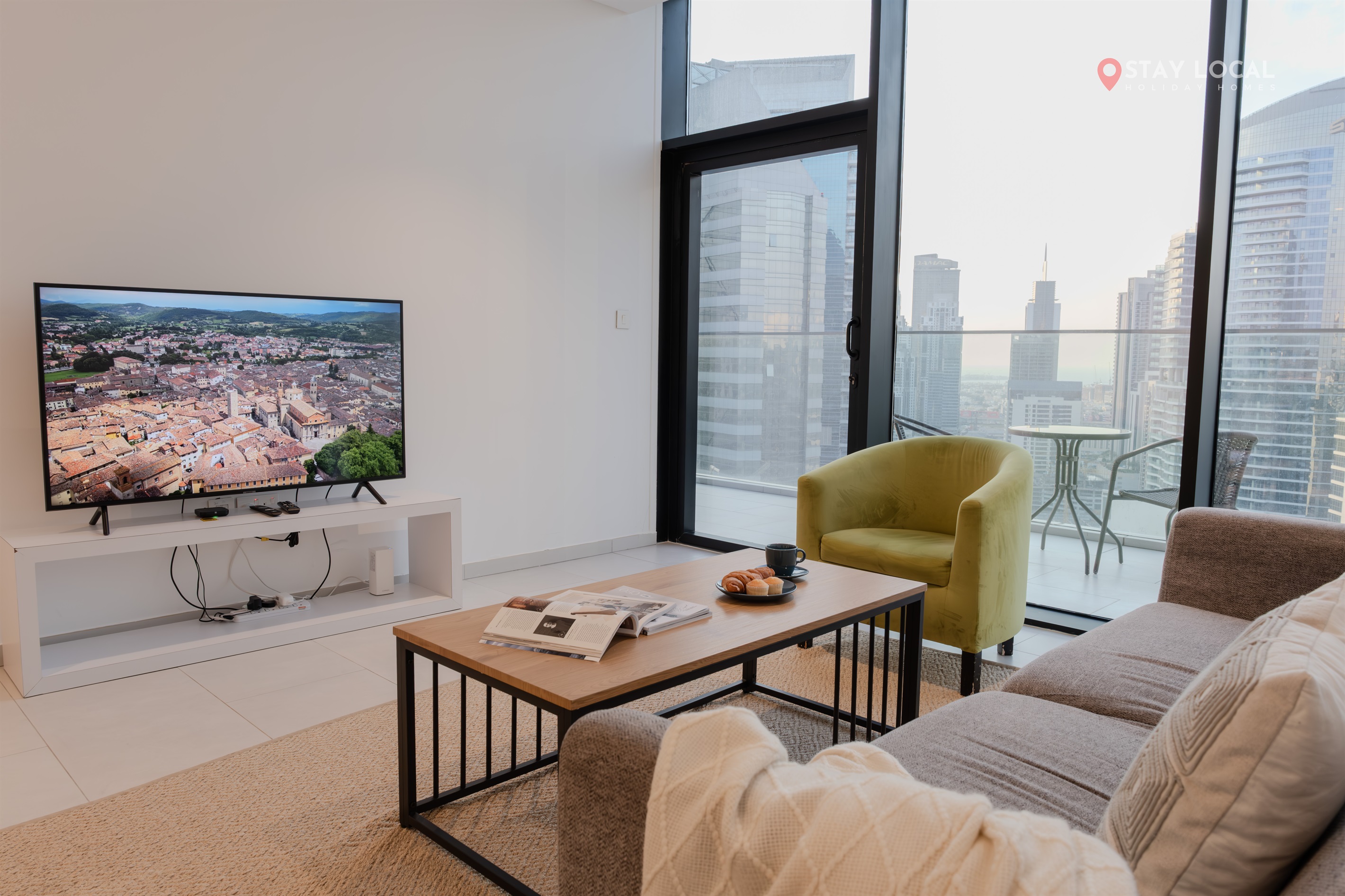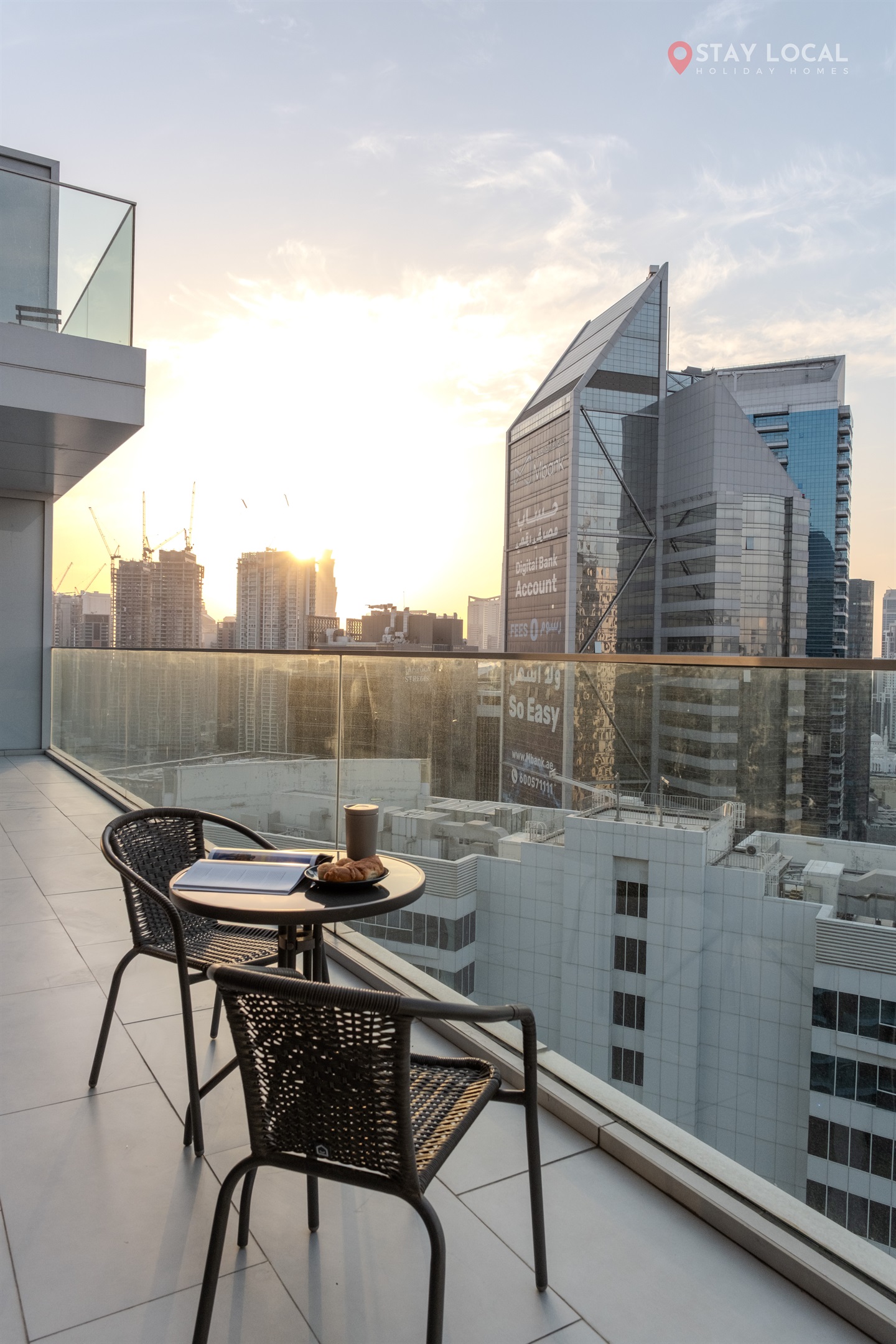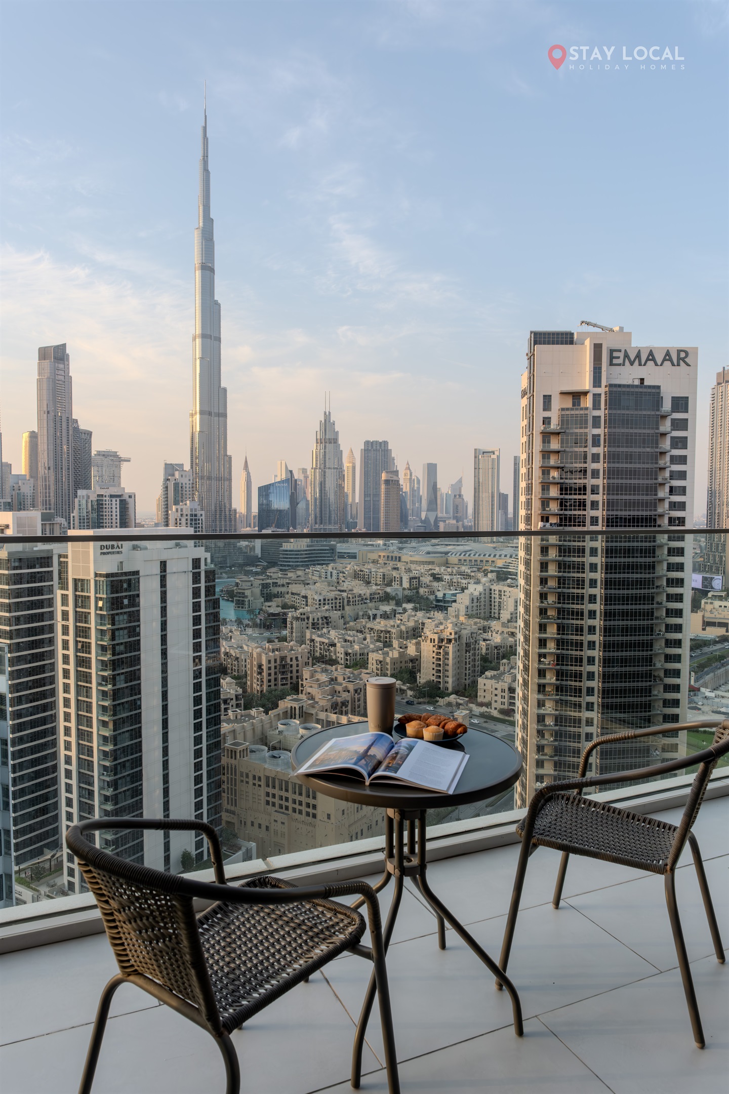 -A spacious balcony offering panoramic city views and the iconic Burj Khalifa, perfect for sipping coffee in the morning or unwinding at sunset.